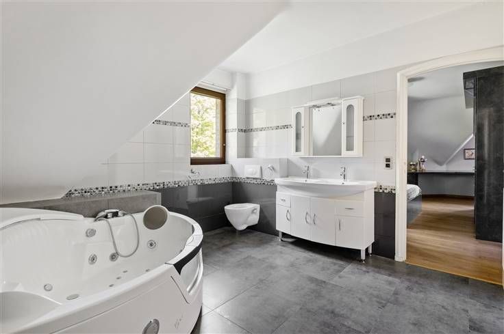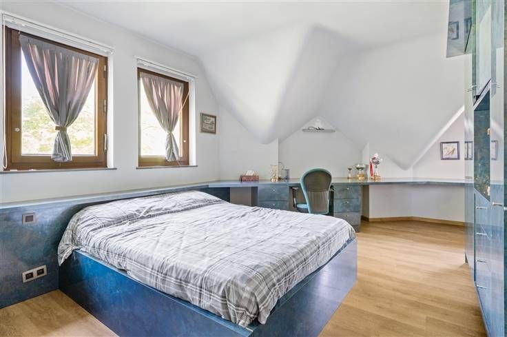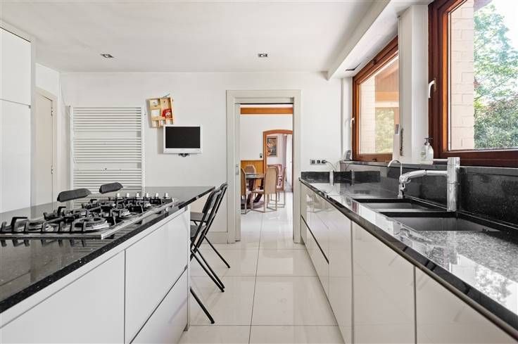 Op een toplocatie in villawijk Den Brandt staat deze rietgedekte villa op een zuidgericht perceel van 1.120 m². Op slechts 100 meter vindt u drie parken (Den Brandt, Nachtegalenpark en Middelheimpark). Deze zeer goed onderhouden woning, gebouwd in 1958, heeft een solide betonstructuur en geniet van uitstekende verbindingen. Indeling: De automatische poort aan de straatzijde leidt naar een oprit en garage. Bij binnenkomst valt de houten trap in de ruime inkomhal meteen op. De gigantische leefruimte op originele parket biedt tal van mogelijkheden. Aangrenzend bevinden zich een eetkamer en een vernieuwde keuken met Miele-toestellen en Boretti gasvuur. Naast de keuken zijn een bijkeuken, toilet met douche en zij-ingang. De inkomhal biedt toegang tot een vestiaire en de garage. De zuidgerichte tuin is ideaal om te ontspannen. Op de eerste verdieping zijn er 4 slaapkamers. De masterbedroom heeft airco, ingemaakte kasten en een badkamer. Een tweede slaapkamer (met airico) heeft een dressing en badkamer met jacuzzi. De derde slaapkamer beschikt over een bureau, kasten en een ensuite badkamer. De vierde slaapkamer (met AC) en vierde badkamer geven uit op de nachthal. De zolder, bereikbaar via vaste trap, is ingericht als polyvalente ruimte met ernaast een slaapkamer en badkamer. De kelder biedt een wasruimte, bergruimtes en een technische ruimte met stookolieketel.