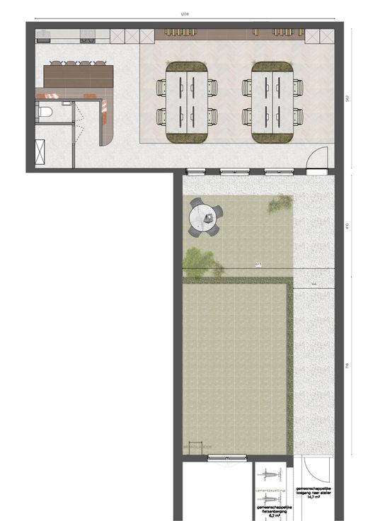Het kantoor is achterin op het perceel gelegen en is toegankelijk via de gemeenschappelijke toegang van het gebouw. Door de ligging achterin kan je hier in alle rust werken. Aansluitend aan het kantoor ligt de privé tuin horende bij het kantoor. Ideaal voor een ontspannende lunchpauze of drankje na het werk.
