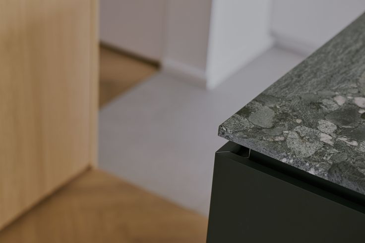 Open keuken met ruim kookeiland in prachtige natuursteen en met hoogwaardige inbouwapparatuur (Liebherr, Novi), inclusief praktische Aqualex kraan (gefilterd en spuitwater). Unieke plus: ruime, berging met ingebouwde kast voor wasmachine en droger op hoogte.