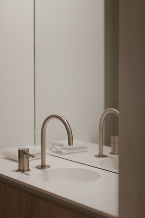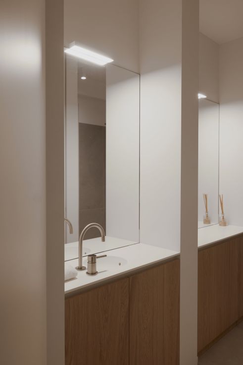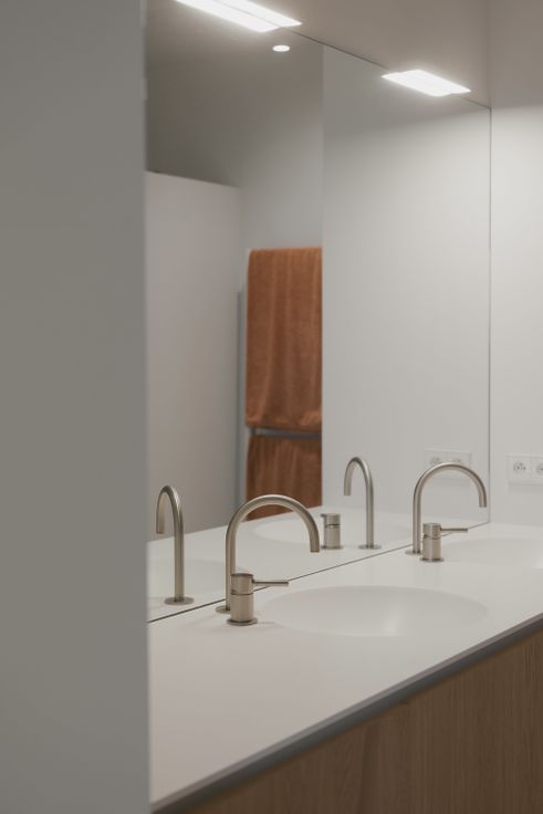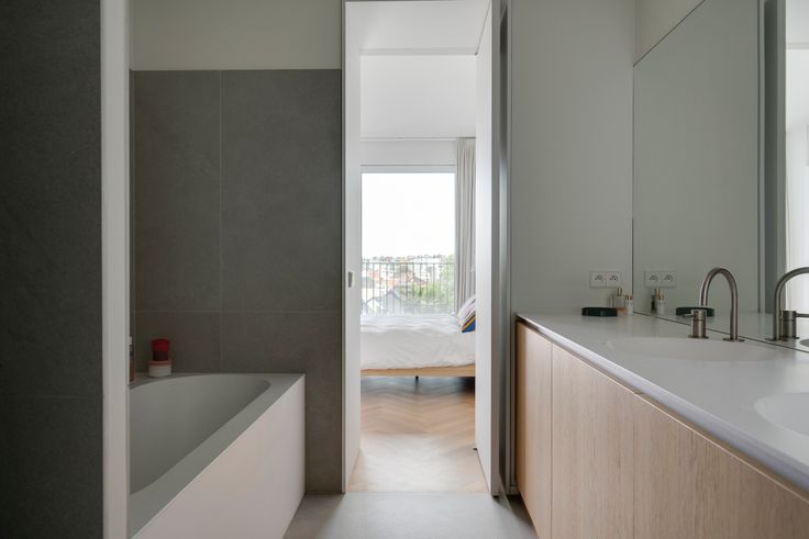 Smeedijzeren glazen deur leidt naar drie slaapkamers. Master bedroom met groot schuifraam en en-suite badkamer (inloopdouche, bad, toilet, kamerbrede spiegel, ...). Tweede badkamer met inloopdouche en toilet, verandert dankzij slimme schuifdeur in afzonderlijk gastentoilet.