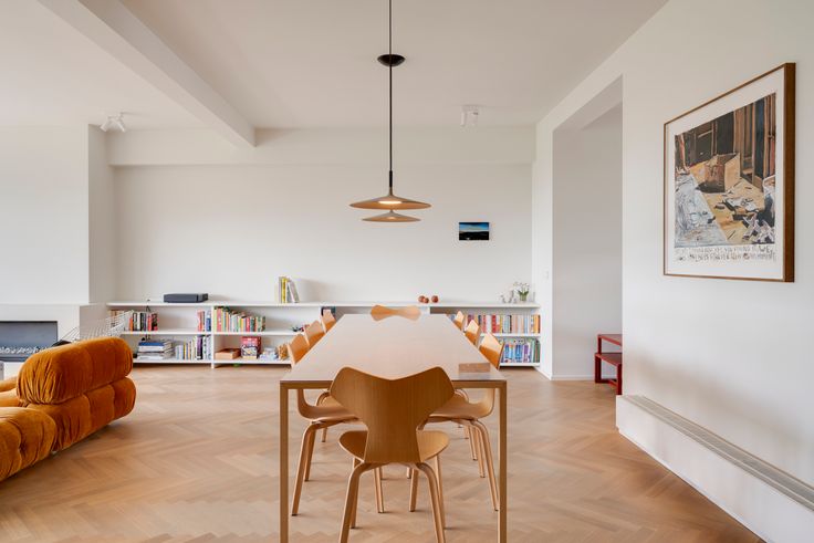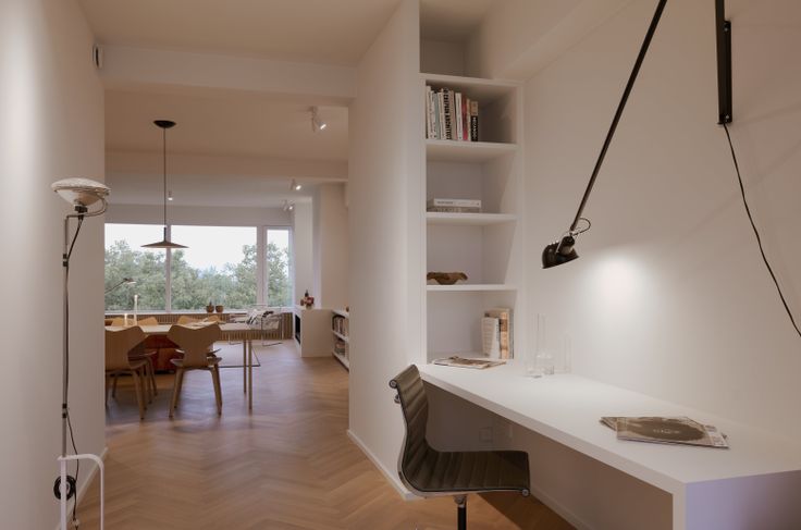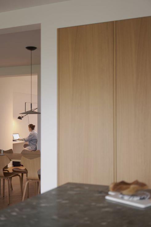 Zeer ruime leefruimte met doorkijk, sfeervolle haard, boekenkast en eikenfineer details. Aparte bureauruimte met ingebouwde kast en bureau, ideaal voor thuiswerk.