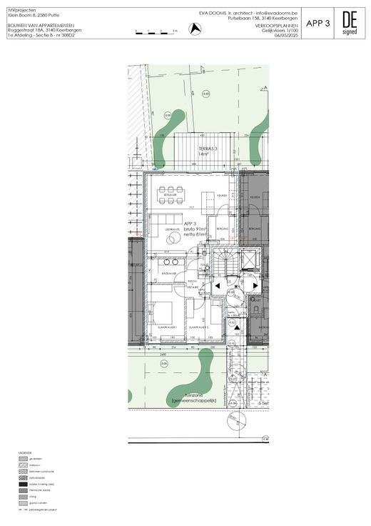 Gelijkvloers appartement 3 is een ruim appartement van 91m² met 2 slaapkamers, 1 badkamer en een private tuin met terras van 70m².