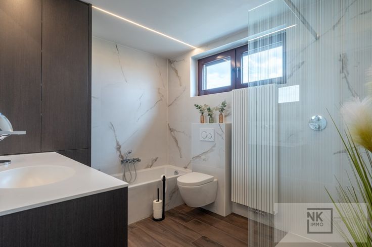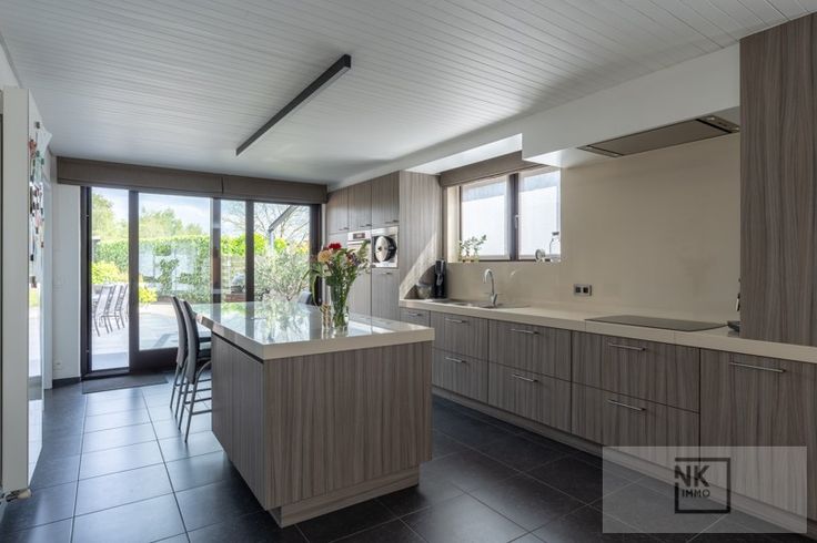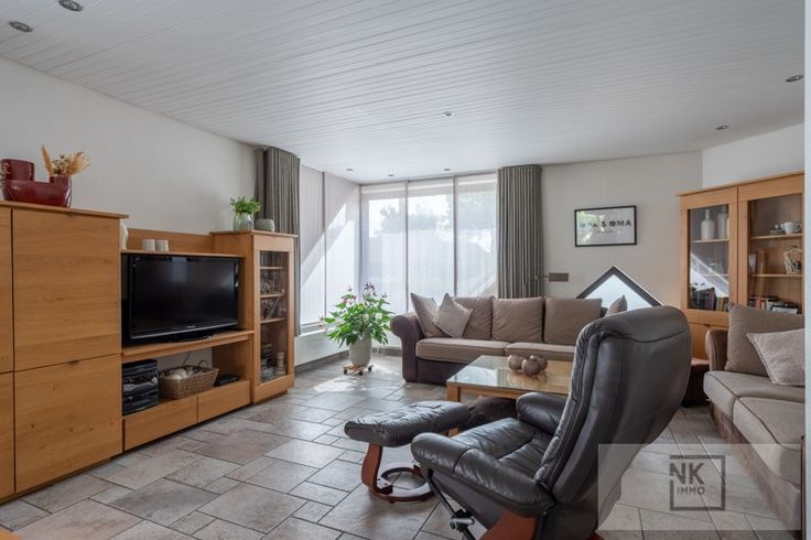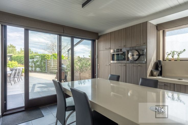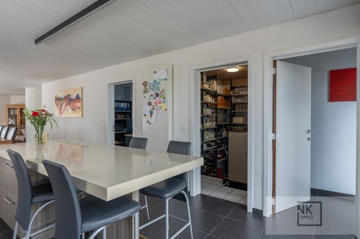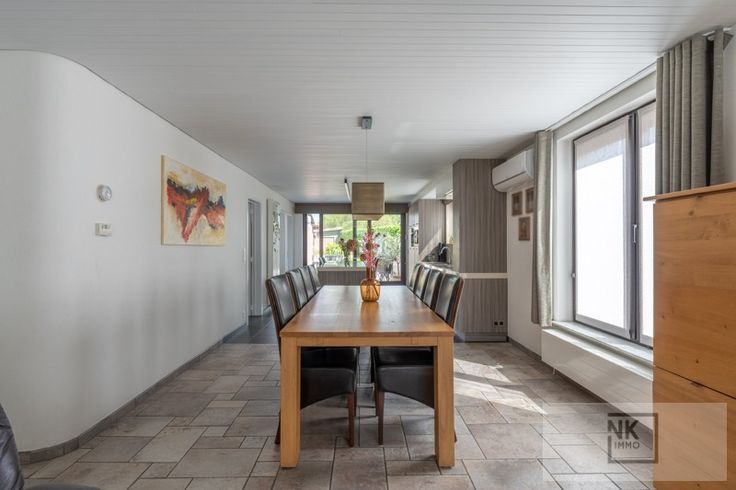 Deze comfortabele woning verwelkomt je via een ruime inkomhal met gastentoilet. De lichtrijke leefruimte biedt de mogelijkheid tot het installeren van een haard en sluit aan op een gezellige eetkamer. De open keuken is volledig uitgerust met hoogwaardige toestellen, granieten werkblad, inductiekookplaat, ingebouwde dampkap van Novy, dubbele koelkast, vaatwasser, oven en zelfs een stoomoven, beiden van Miele. Aansluitend vind je een berging, bureau en een wasplaats met extra douche en toilet.