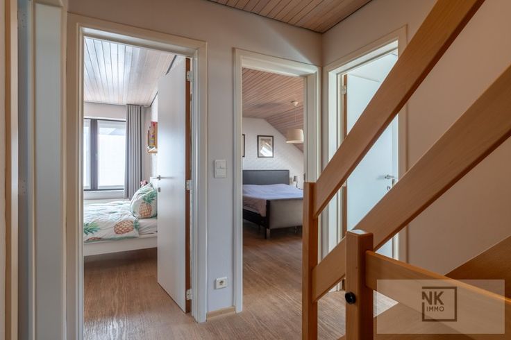 Op de eerste verdieping bevinden zich drie slaapkamers en een vernieuwde badkamer met inloopdouche, ligbad, toilet en lavabo. De zolderverdieping, bereikbaar via een vaste trap, biedt ruimte voor twee extra slaapkamers.