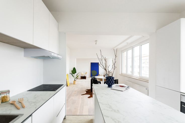 Elk appartement is voorzien van een ruime inkomhal die overloopt in een mooie leefruimte met veel lichtinval. Daar zorgen de vele raampartijen en hoge plafonds voor. Meer dan plaats genoeg hier voor een groot salon en een eetkamer. Aansluitend aan de leefruimte ligt de open keuken. Nieuw, tijdloos en volledig uitgerust.