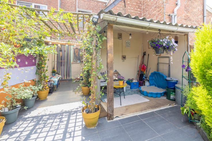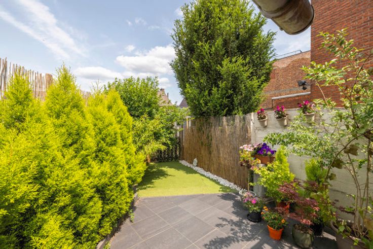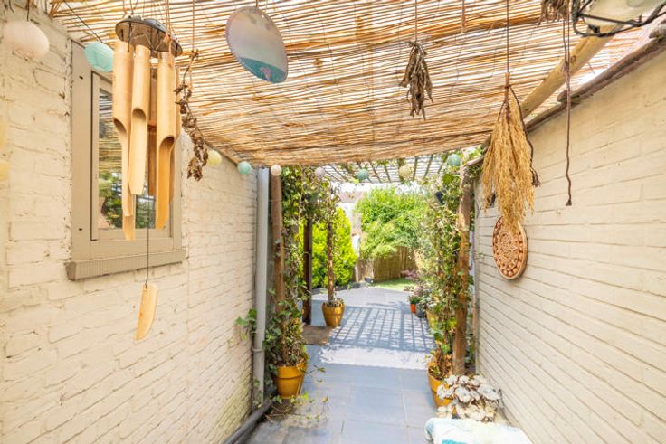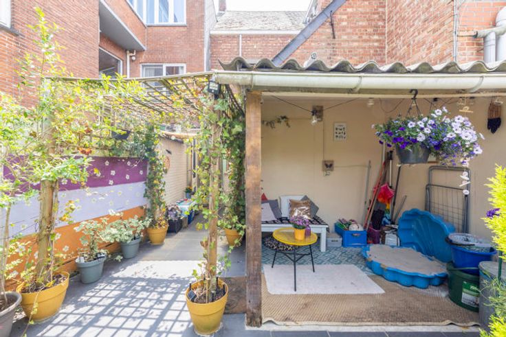 Gezellig tuintje met overdekt terras; servitudeweg naar de Kapellebaan (achterliggende straat).