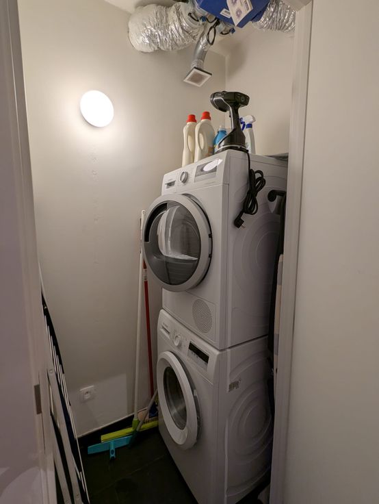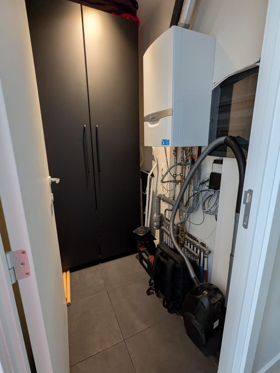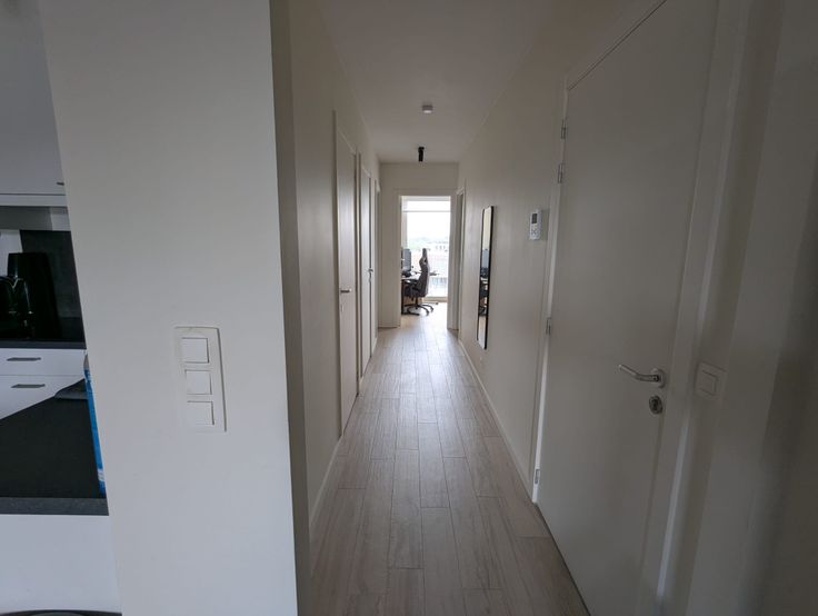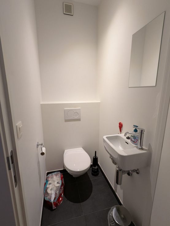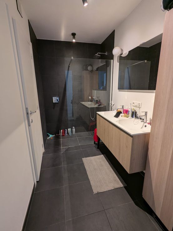 Verder heb je een apart toilet met daarnaast de badkamer. Die heeft een inloopdouche met regendouche en aparte handsproeier, een badkamermeubel met 2 lavabo's en een aparte wasruimte met ventilatie doorheen het gehele appartement.