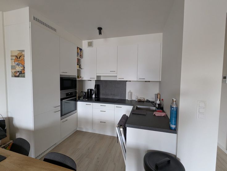 Je komt binnen in de leefruimte. Die bestaat uit een ruime woonkamer die naadloos overgaat in de eetkamer en keuken. De living heeft de hele dag licht door de raampartij over de volledige breedte van het appartement, die ook toegang biedt tot een gezellig terras met zicht op de binnentuin van het complex. De keuken is uitgerust met een microgolfoven, een heteluchtoven, een inductie-kookplaat, vaatwasmachine en lavabo.