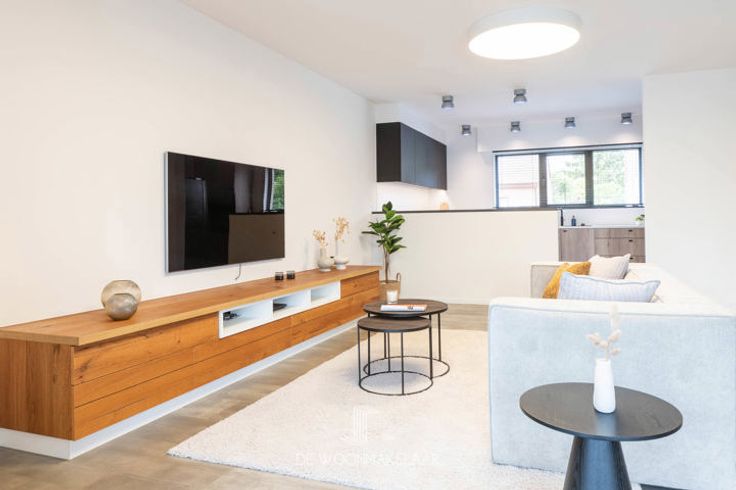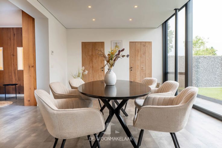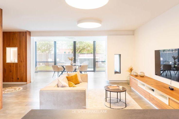 De leefruimte is indrukwekkend, met een dubbele gashaard als sfeervolle blikvanger en ingemaakte kasten die zorgen voor een strak geheel. Mooie eiken binnendeuren en een groot dubbel schuifraam naar de tuin vervolledigen het plaatje.