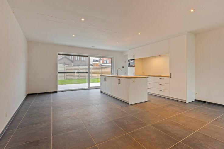 Via de inkomhal met vestiaireruimte en gastentoilet, komen we terecht in de lichtrijke leefruimte, deze is opgedeeld in een eethoek, zithoek en open keuken. De open keuken is voorzien van alle hedendaagse toestellen en biedt voldoende opbergruimte. Naast de keuken is er een berging met inbouwkasten en aansluiting voor wasmachine aanwezig