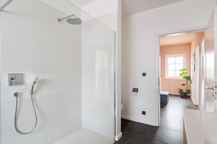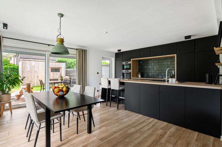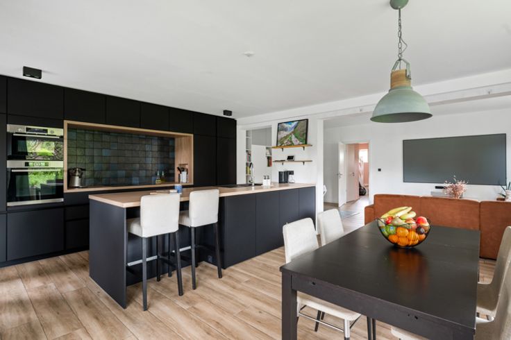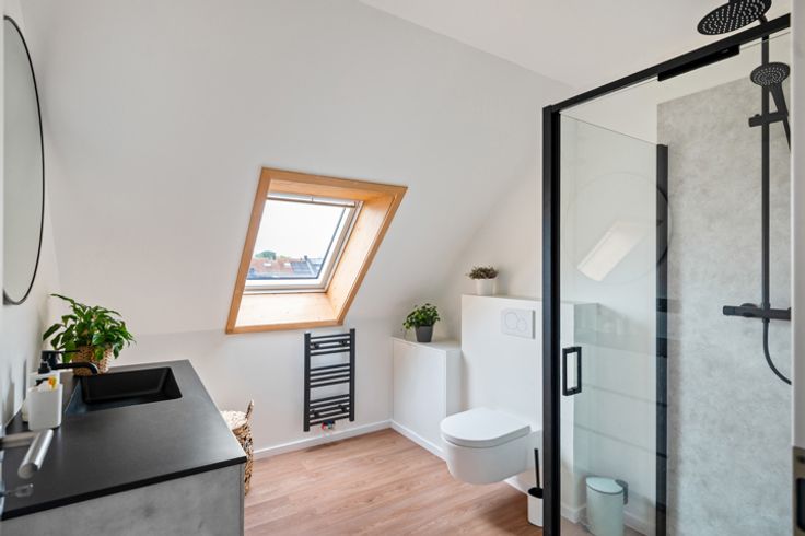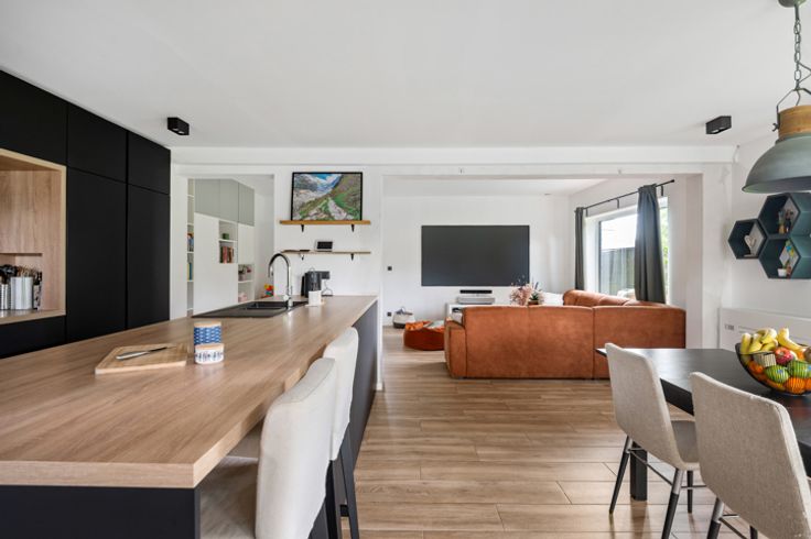 De grote raampartijen aan de zij-en achterzijde geven je een constant gevoel van licht. Zelfs tijdens de donkere winter en herfstmaanden zal je kunnen genieten van veel natuurlijk licht. Kosten noch moeite werd er gespaard om van deze verdieping een pareltje te maken. De keuken komt rechtstreeks uit de boekjes. Volledig op maat gemaakt en voorzien van alle hedendaagse normen. Dankzij het gezellig eiland, kook je hier voor een publiek of keuvel je samen aan de toog tijdens de apéro (of de afwas...).