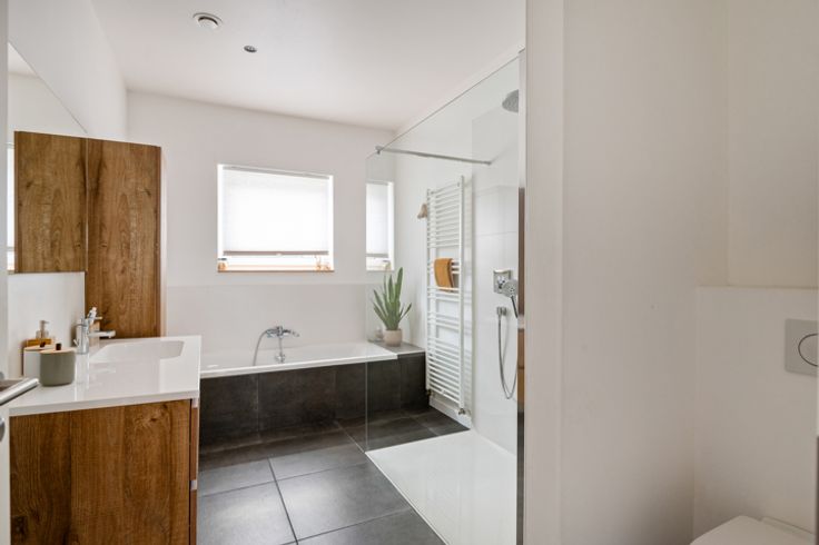 Deze 1ste verdieping heeft een master bedroom en eerste kinderkamer. Deze kan perfect gebruikt worden als bureauruimte. Verder is er nog een smaakvolle badkamer waar je je op vakantie waant! Zo eentje waar alles aanwezig is: een bad, douche, lavabomeubel, wc en veel natuurlijk licht.