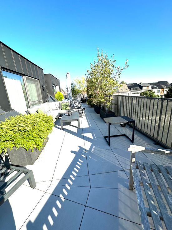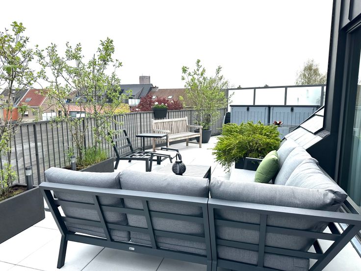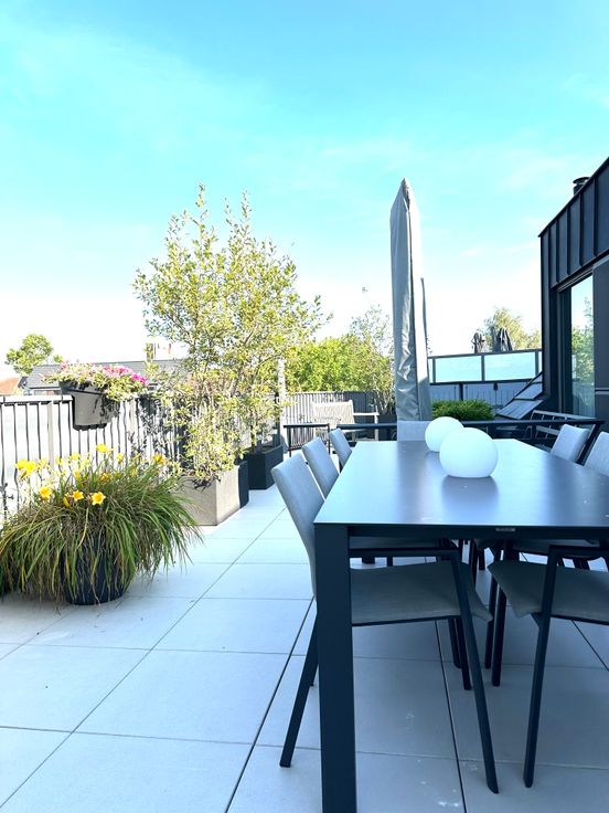 Volledig ingericht terras met planten en nieuwe tuinmeubelen