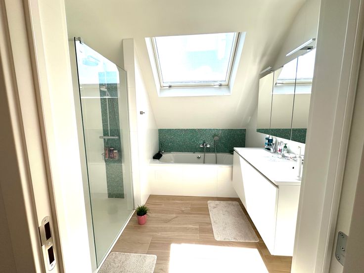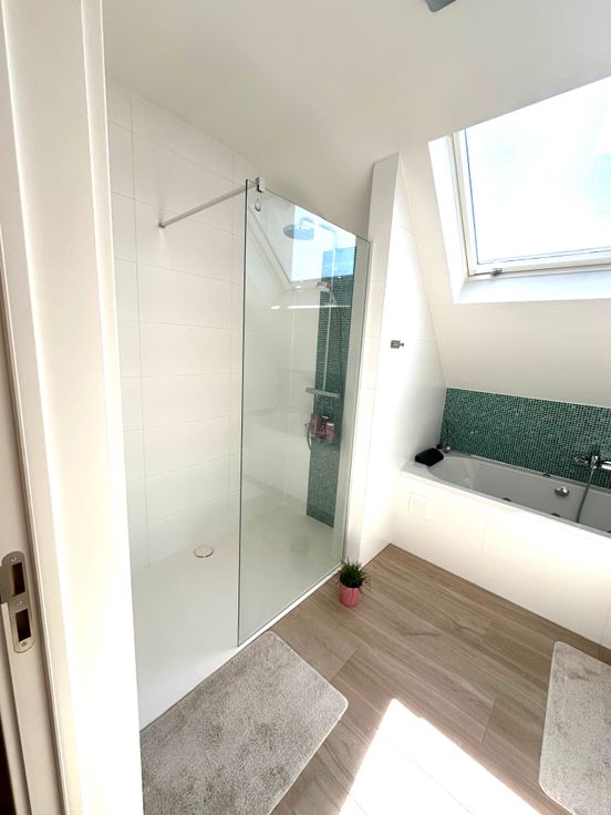 Badkamer met bad/douche, dubbele lavabo en dakraam