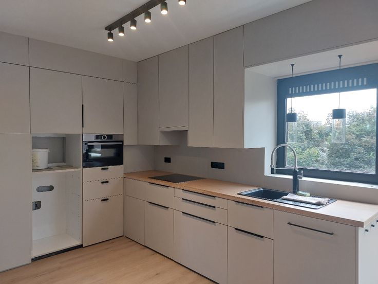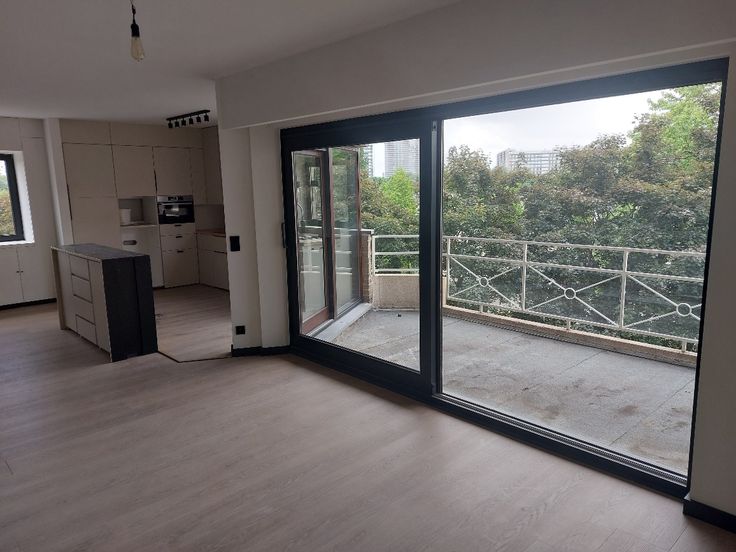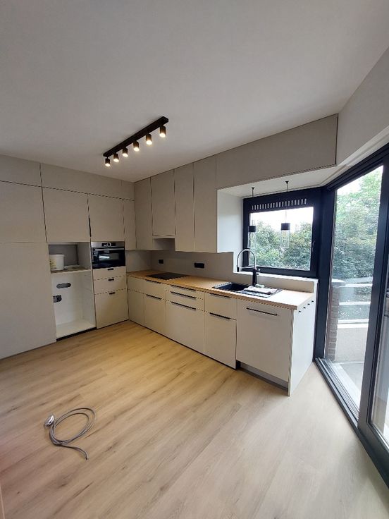 - Ruime leefruimte met open keuken en overal ingemaakte kasten. Nutsvoorzieningen zijn reeds voorzien om een keukeneiland te plaatsen. Een schuifraam in uw leefruimte en een deur vanuit de keuken, geven toegang tot het Zuid gericht terras.