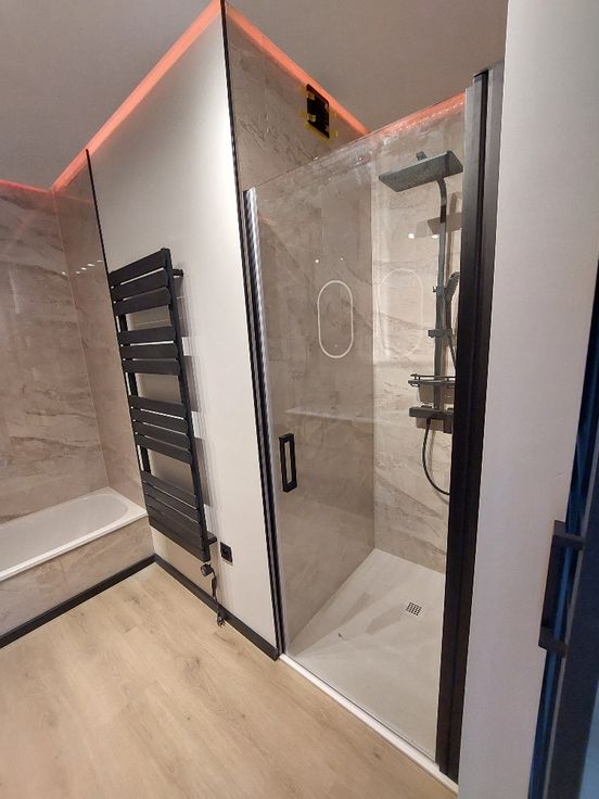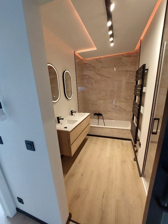 - Volledig nieuwe badkamer met dubbele lavabo, ligbad en inloopdouche