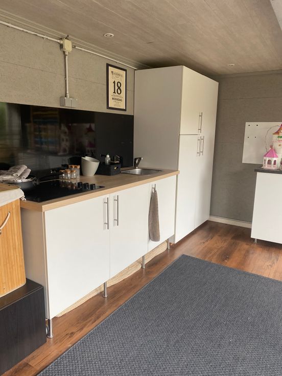 Achteraan aan de tuin een kamer met zomerkeuken met veel opbergruimte