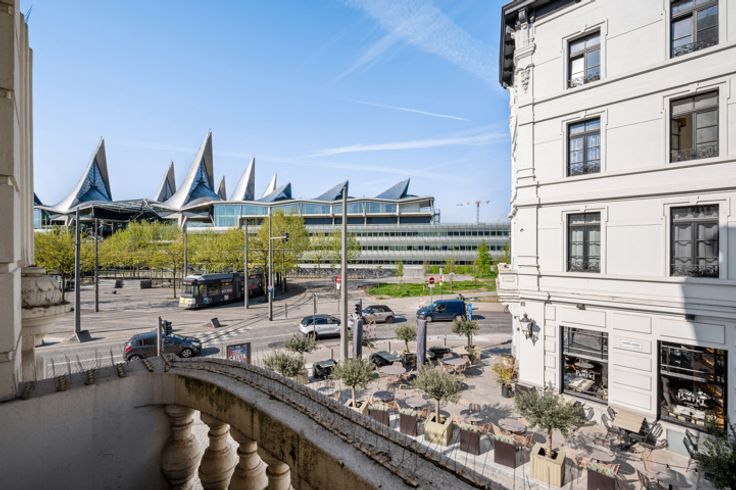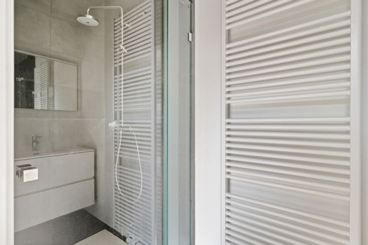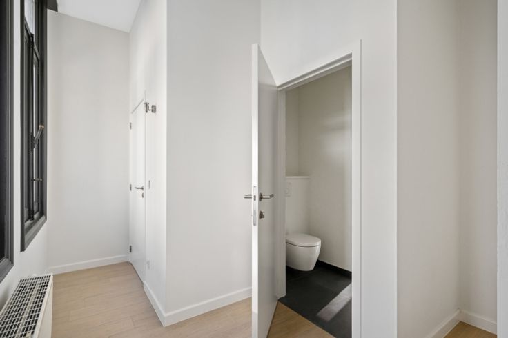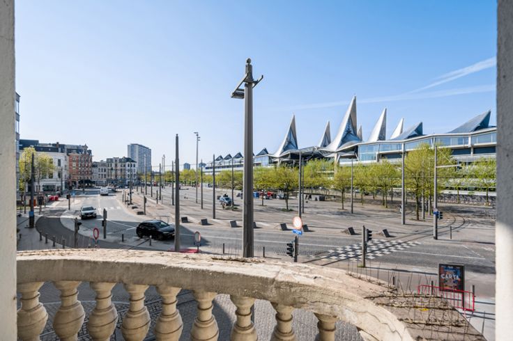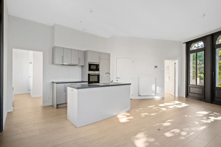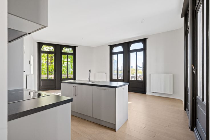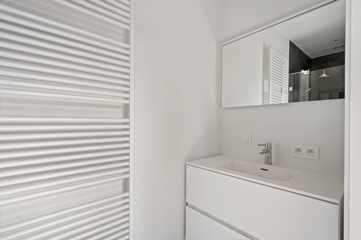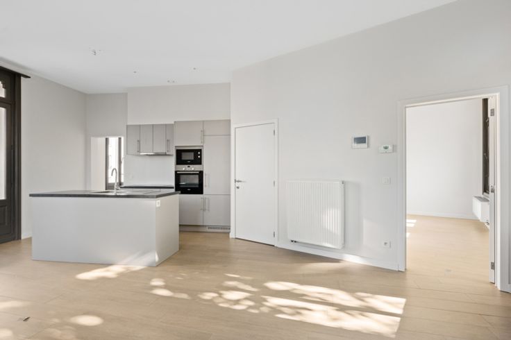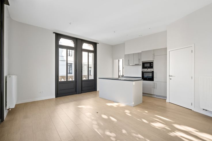 Je betreedt het appartement via de hal met gastentoilet en komt terecht in de leefruimte met open keuken. De keuken werd van alle apparatuur voorzien. De grote raampartijen, dewelke telkens toegang geven tot een balkon, zorgen voor een zee aan licht. De slaapkamer met aansluitend de badkamer met douche en enkel lavabomeubel bevinden zich overigens aan de andere zijde van het appartement.