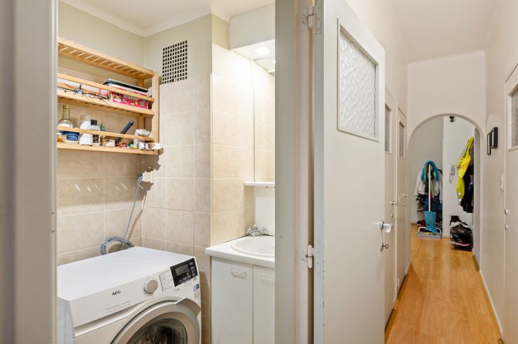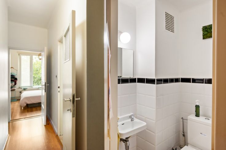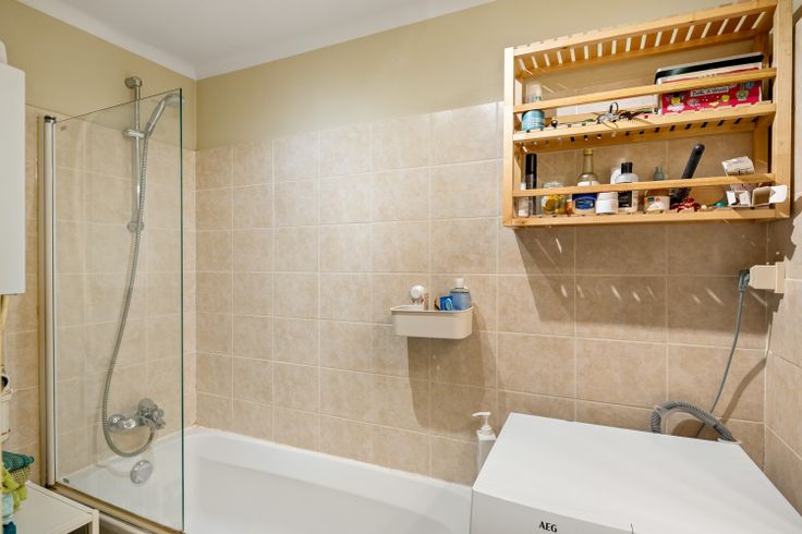 Twee slaapkamers aan de achterzijde van het gebouw, een eerder kleine ingerichte badkamer met ligbad en douchecombinatie, enkele wastafel en ruimte voor was- en droogmachine completeren de wooneenheid.
