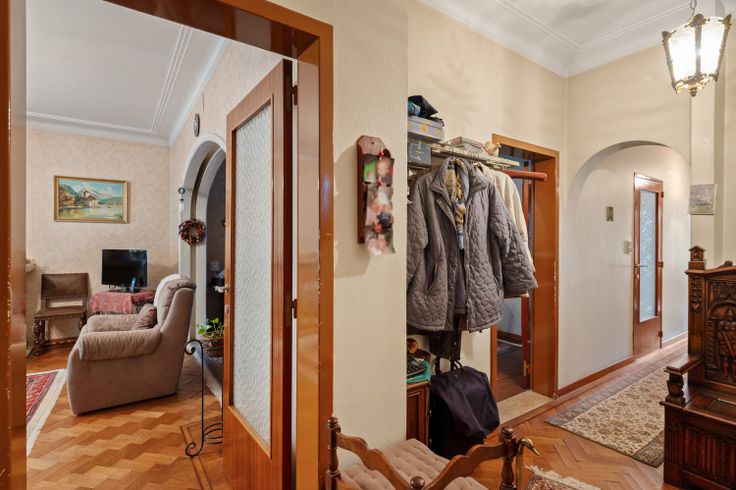 Een gemeenschappelijke inkom met traphal en toegang naar de kelderverdieping.